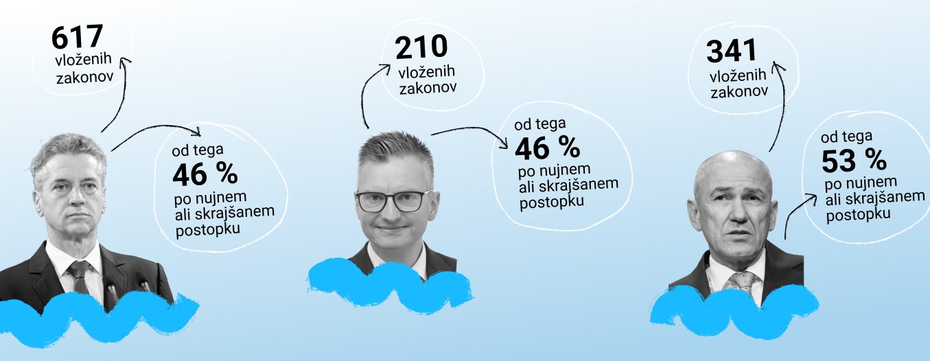 A več kot količina vloženih oz. sprejetih zakonov nam pove podatek o tem, po kakšnem postopku so bili ti obravnavani. Tako je bilo v času Golobove koalicije kar 46 odstotkov vseh zakonov obravnavanih po nujnem ali skrajšanem postopku.